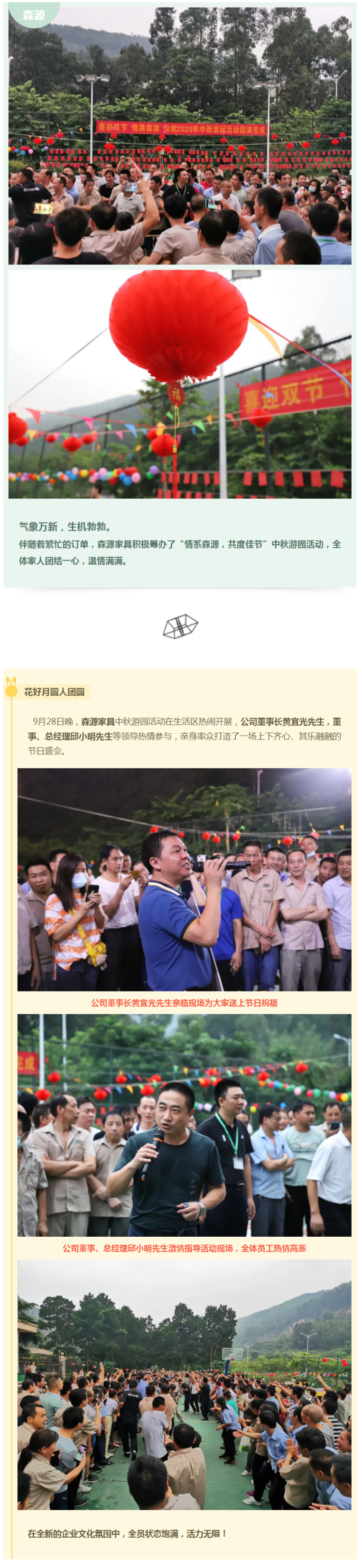 伴隨著繁忙的訂單,森源家具積極籌辦了“情系森源,共度佳節(jié)”中秋游園活動(dòng),全體家人團(tuán)結(jié)一心,溫情滿滿。
