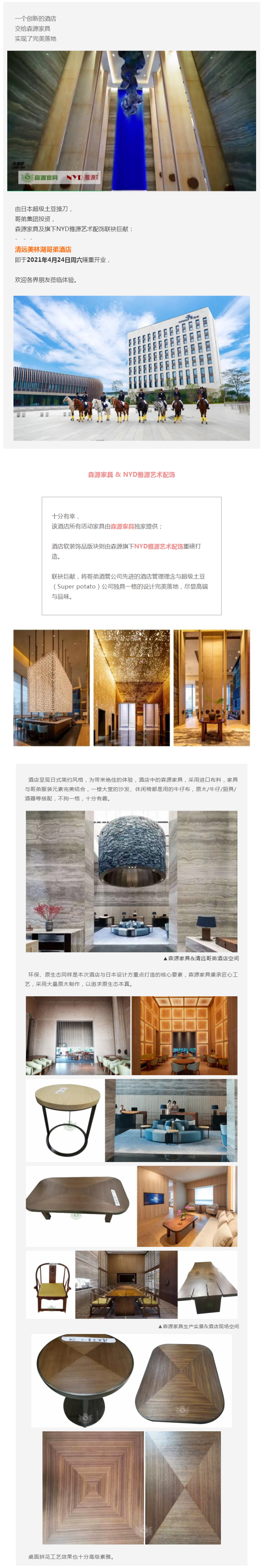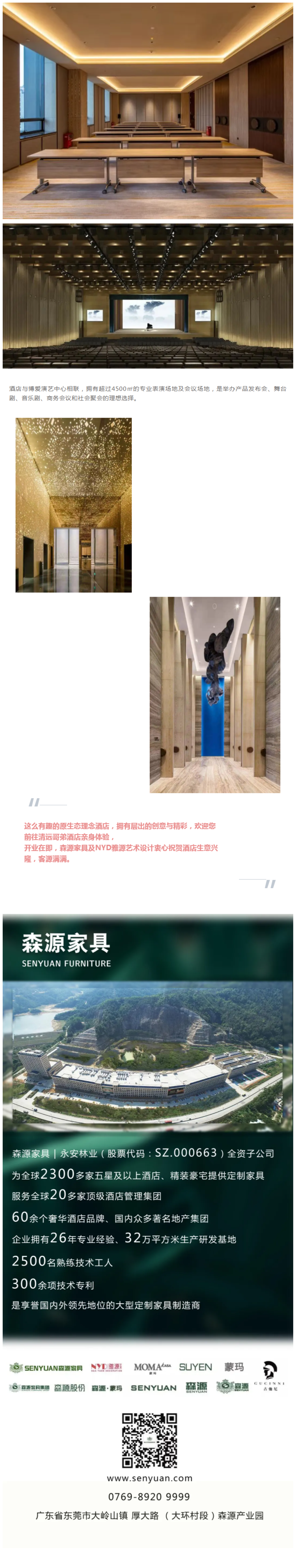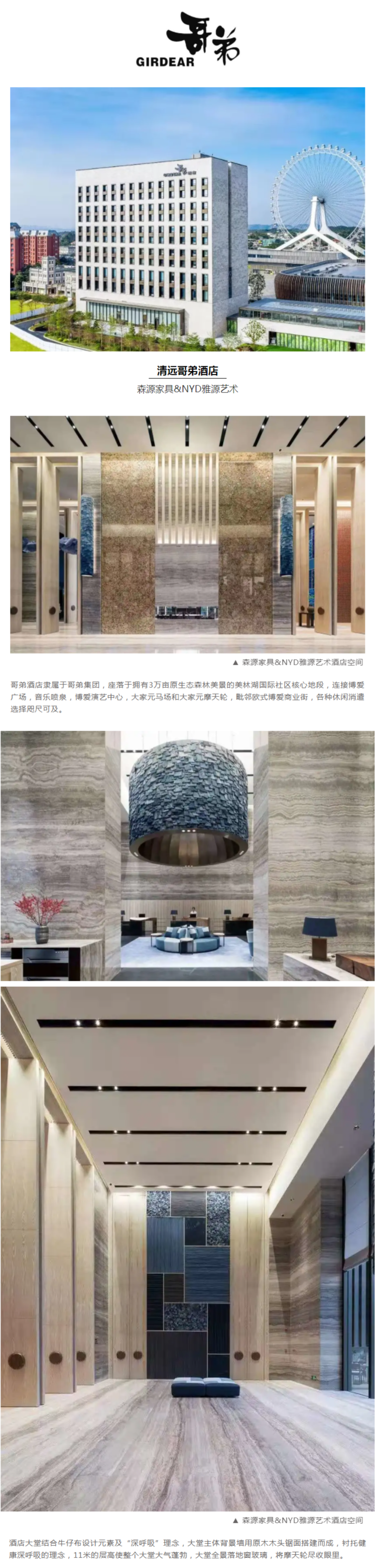 一個(gè)創(chuàng)新的酒店 交給森源家具 實(shí)現(xiàn)了完美落地 由日本超級(jí)土豆操刀, 哥弟集團(tuán)投資, 森源家具及旗下NYD雅源藝術(shù)配飾聯(lián)袂巨獻(xiàn): 清遠(yuǎn)美林湖哥弟酒店 即于2021年4月24日周六隆重開(kāi)業(yè), 歡迎各界朋友蒞臨體驗(yàn)。 十分有幸, 該酒店所有活動(dòng)家具由森源家具獨(dú)家提供; 酒店軟裝飾品版塊則由森源旗下NYD雅源藝術(shù)配飾重磅打造。 聯(lián)袂巨獻(xiàn),將哥弟酒管公司先進(jìn)的酒店管理理念與超級(jí)土豆(Super potato)公司獨(dú)具一格的設(shè)計(jì)完美落地,盡顯高端與品味。 酒店呈現(xiàn)日式簡(jiǎn)約風(fēng)格,為帶來(lái)絕佳的體驗(yàn),酒店中的森源家具,采用進(jìn)口布料,家具與哥弟服裝元素完美結(jié)合,一樓大堂的沙發(fā)、休閑椅都是用的牛仔布,原木/牛仔/廚具/酒器等搭配,不拘一格,十分有趣。 作為森源旗下藝術(shù)配飾公司 —— NYD雅源藝術(shù)同樣也是實(shí)力派, 曾打造過(guò):迪拜洲際酒店、比利時(shí)凱賓斯基、廈門(mén)特房波特曼酒店、上海寶華萬(wàn)豪、三亞太陽(yáng)灣柏悅、深圳四季、麗江瑞吉、東莞萬(wàn)達(dá)文華等多個(gè)頂級(jí)酒店藝術(shù)空間軟裝配飾,每次出手即是非凡。 哥弟酒店隸屬于哥弟集團(tuán),座落于擁有3萬(wàn)畝原生態(tài)森林美景的美林湖國(guó)際社區(qū)核心地段,連接博愛(ài)廣場(chǎng),音樂(lè)噴泉,博愛(ài)演藝中心,大家元馬場(chǎng)和大家元摩天輪,毗鄰歐式博愛(ài)商業(yè)街,各種休閑消遣選擇咫尺可及。 這么有趣的原生態(tài)理念酒店,擁有層出的創(chuàng)意與精彩,歡迎您前往清遠(yuǎn)哥弟酒店親身體驗(yàn), 開(kāi)業(yè)在即,森源家具及NYD雅源藝術(shù)設(shè)計(jì)衷心祝賀酒店生意興隆,客源滿滿。