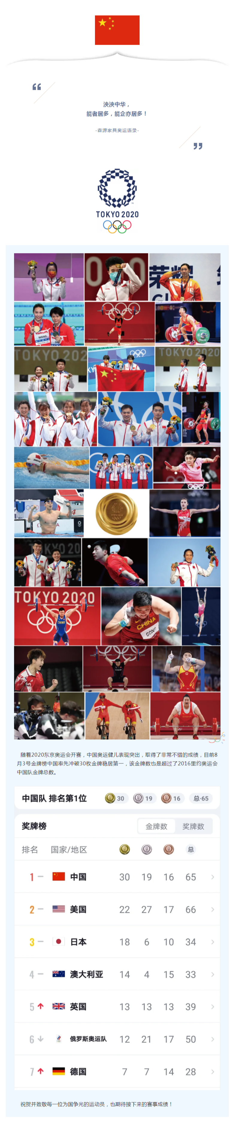 隨著2020東京奧運(yùn)會開賽,中國奧運(yùn)健兒表現(xiàn)突出,取得了非常不錯的成績,目前8月3號金牌榜中國率先沖破30枚金牌穩(wěn)居第一,該金牌數(shù)也是超過了2016里約奧運(yùn)會中國隊(duì)金牌總數(shù)。