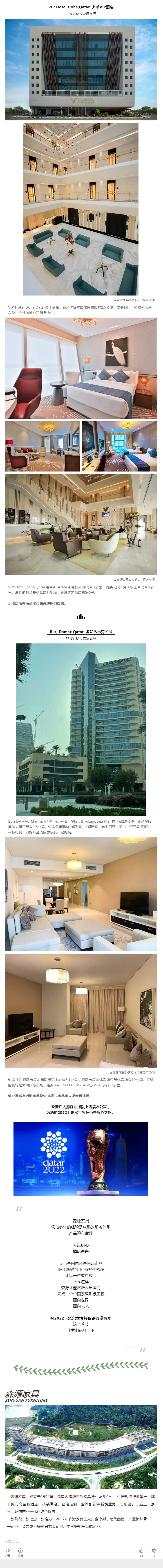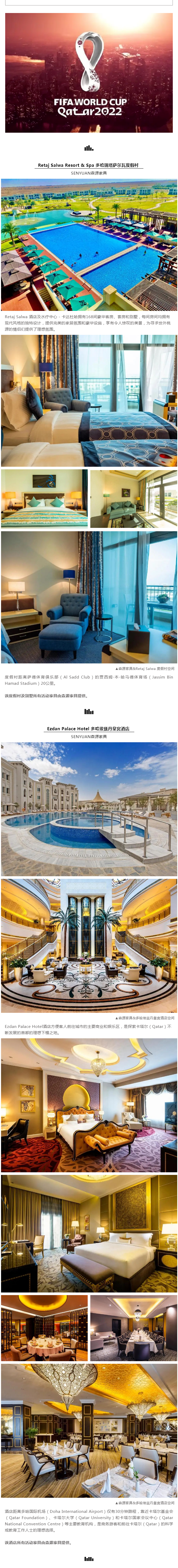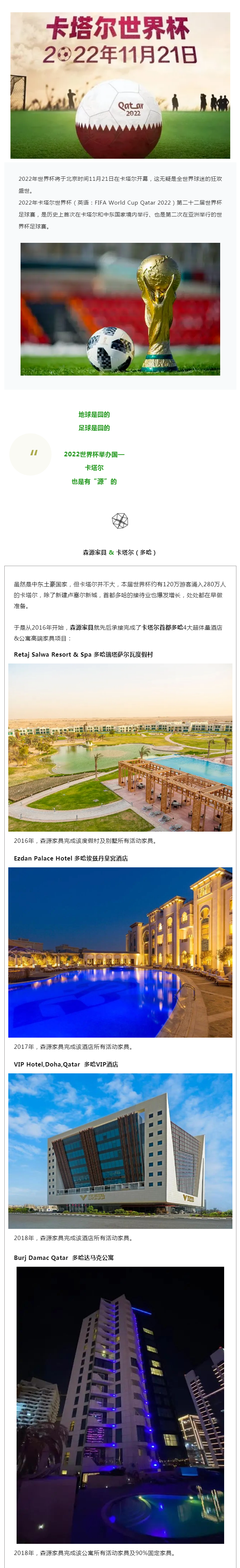 森源家具十分開心卡塔爾迎來了2022**杯,也十分榮幸能為其首都多哈,在本屆**杯接待酒店中貢獻一點力量。