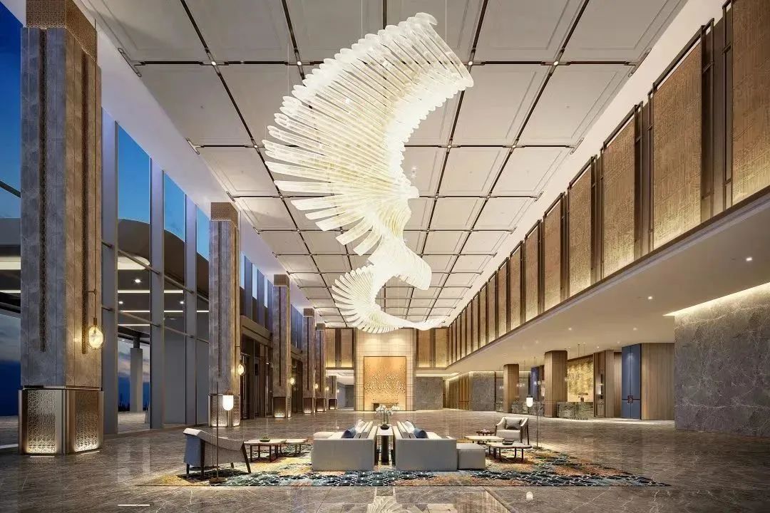 蘇州園林中常用疊石的形式,層層疊進,墻面玻璃屏風(fēng)層疊造型互相碰撞,天花造型遙相呼應(yīng),波瀾起伏。將安逸溫婉的蘇式園林與標(biāo)志性文化元素重組,融入現(xiàn)代建筑體態(tài)概念,空間氣勢鋪陳而出,“中而新,蘇而新”對傳統(tǒng)的傳承與創(chuàng)新,呈現(xiàn)出大堂閬苑瑤臺之美。
