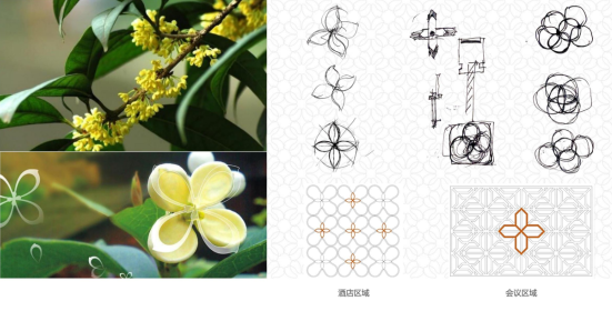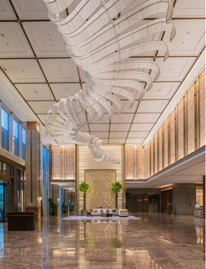 蘇州國際會議酒店由蘇州建筑裝飾設(shè)計研究院有限公司主持設(shè)計,設(shè)計團隊以蘇州市花“桂花”中的“金桂”為設(shè)計靈感,桂花喻為“清雅高潔”,表明將桂花種植在園中,既可以時時觀賞又可以時時自勉,演繹了方正和圓潤剛?cè)岵?,若隱若現(xiàn)點綴于整個酒店空間中。