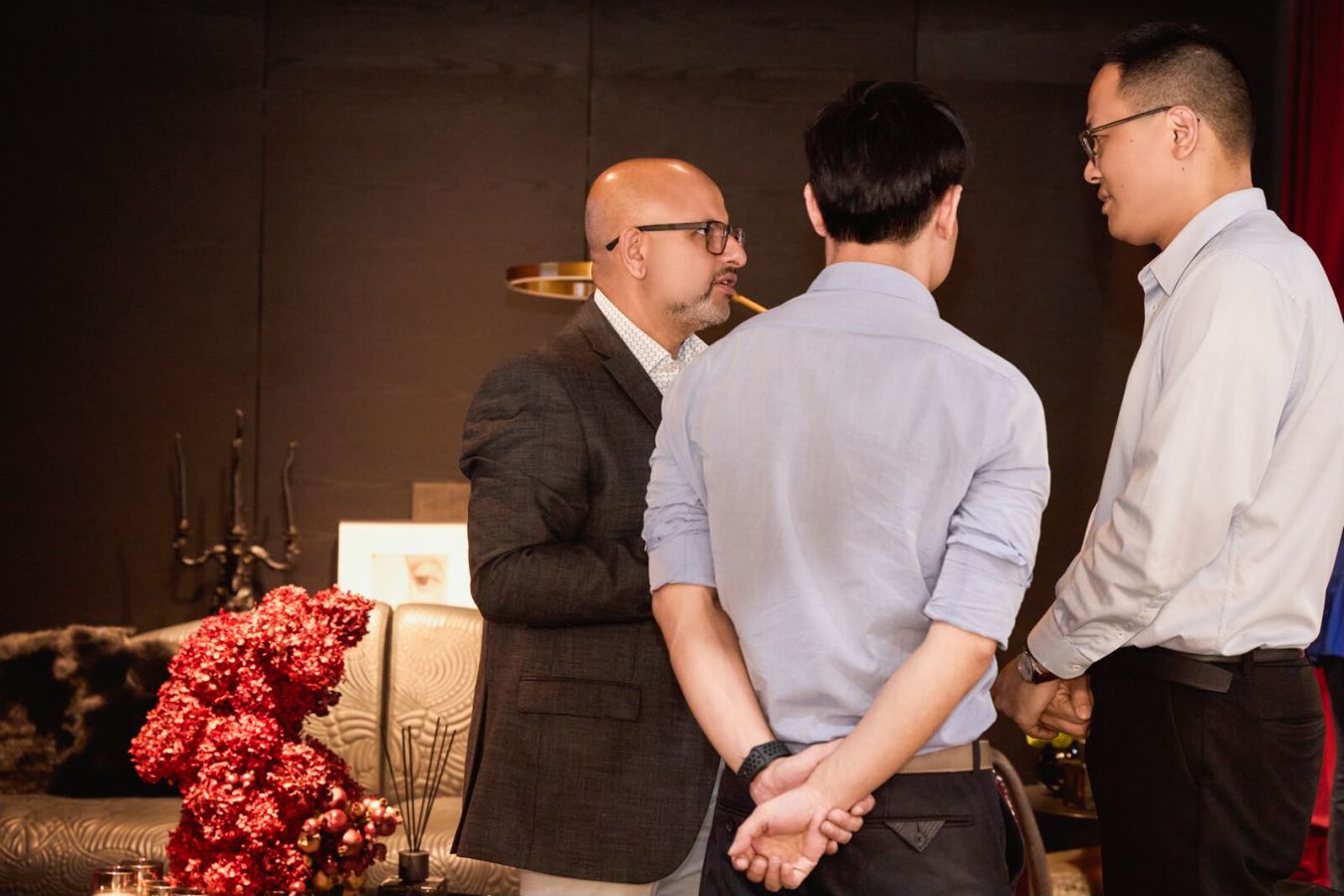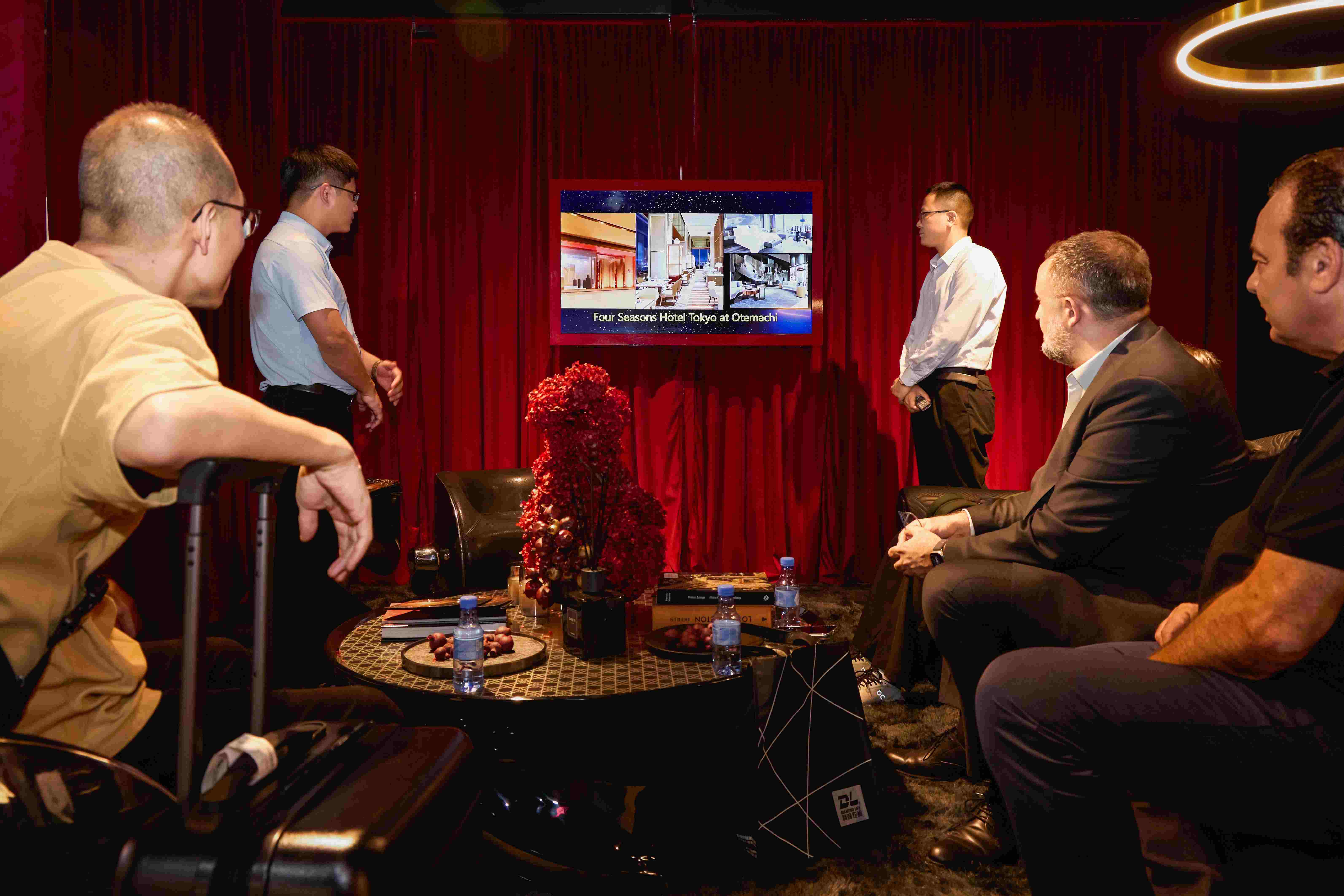 SENYUAN森源家具國(guó)際部負(fù)責(zé)人嚴(yán)其年(右一)與客戶(hù)交流中