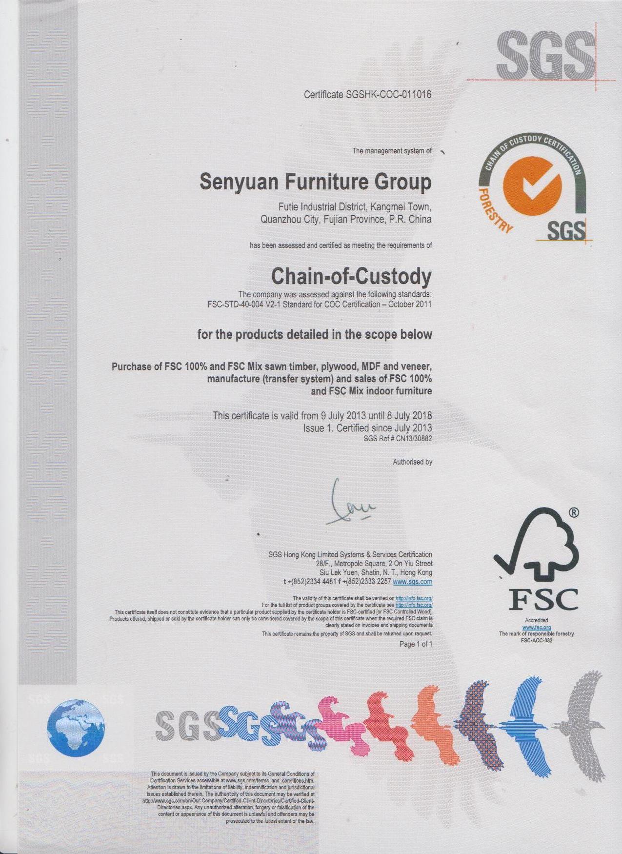 2013年7月12號(hào),森源收到SGS(瑞士通用公證行,從事檢驗(yàn)、測試、質(zhì)量保證與認(rèn)證的知名國際機(jī)構(gòu))頒發(fā)FSC